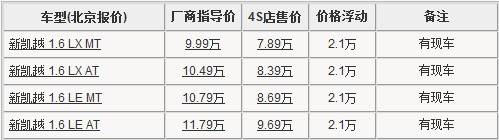 根据北京地区通用别克4S店销售人员介绍:别克凯越近期新推除两款低配车型,为1.6 LX AT及1.6 LX MT车型,指导价最低为9.99万元。目前全系统一优惠2.1万元,经销商最低售价为7.89万元。目前别克凯越店内车源充足。