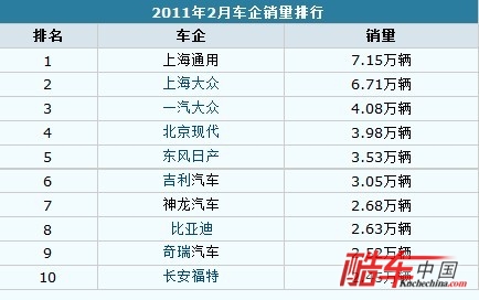 2011年2月车企销量排行