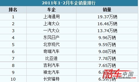 1-2月,销量排名前十位的轿车生产企业依次为:上海通用、上海大众、一汽大众、东风日产、北京现代、奇瑞、比亚迪、吉利、神龙和长安福特,分别销售19.37万辆、16.46万辆、13.74万辆、9.96万辆、9.59万辆、9.08万辆、7.78万辆、7.65万辆、6.87万辆和6.59万辆。与上年同期相比,比亚迪和长安福特销量下降,其它企业增长不一,其中上海大众和上海通用增速最明显。1-2月,上述十家企业共销售107.09万辆,占轿车销售总量的63%。