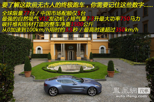 要了解这款前无古人的终极跑车,你需要记住以下这一串数字。One-77车如其名,全球限量生产77台,其中中国市场的配额仅有5台。它搭载的是世界上最强大的自然吸气V12发动机,7.3升的排气量中能爆发出750马力的最大功率。强大的功率让One-77获得相当可观的行驶表现:1.5吨的车身在3.5秒内完成从静止到100km/h的加速,而在意大利纳多高速环路上测试的最高速度已经超过了350km/h。