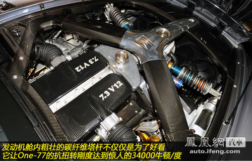 这台搭载庞大V12发动机的重量级跑车满载各种奢华的装修和配置,因此其1500公斤的整备质量显得十分难得。大量使用碳纤维和铝合金材质让One-77在保证轻量化的同时也具有极为坚固的车身,巨大的碳纤维塔杆让One-77的车身抗扭转刚性高达34000牛顿/度,当然全碳纤维结构的车身框架也带来了高的吓人的制造成本,不过对于One-77的顾客来说,金钱已经不是问题,而这台阿斯顿·马丁有史以来最强的跑车所表现出的技术精华才是他们看重的卖点。