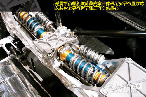 One-77所搭载的V12发动机几乎达到赛车的水准,同样和赛车类似的还有其悬挂布置方式。减震器和螺旋弹簧采用GT赛车常用的水平布置方式,从结构上更有利于降低汽车重心。极为宽大的倍耐力P Zero Corsa轮胎为这款750马力的跑车提供了充足的抓地能力,配合赛车级别的悬挂设定更是让它具有极为凌厉的操控水准。