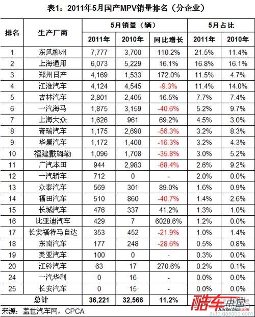 吉林汽车2011年5月MPV销量同比增长16.5%至2801辆,排名由去年5月第七升至第五。