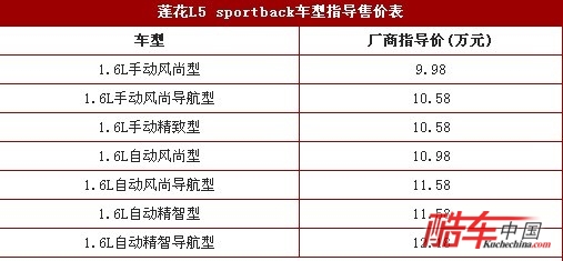 9月23日,莲花汽车旗下莲花L5Sportback在上海正式上市,据悉,莲花L5 Sportback的莲花L5掀背版新车,也是继莲花汽车L5三厢版在今年4月的上海车展上市后的又一款新车,此番共计推出1.6L排量的7款车型以及7种车身颜色供消费者选择,售价区间为9.98-12.18万元,详见下表: