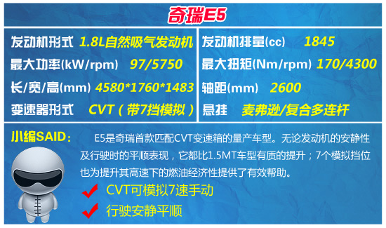 推荐车型四:奇瑞E5 (1.8L+7CVT)