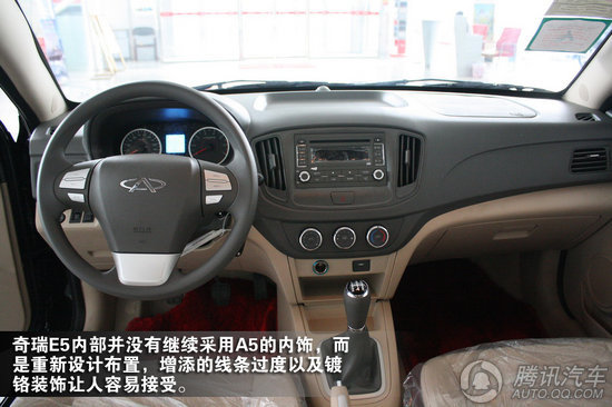 奇瑞E5内部并没有继续采用A5的内饰,而是重新设计布置,增添的线条过度以及镀铬装饰使E5内部更能让现代人所接受。车内上深下浅的内饰颜色搭配显得非常温馨,适合国人家用,较A3而言,E5整体提升了一个台阶。重新设计的中控面板造型新颖,区间层次分明。