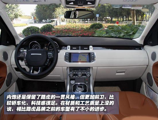 进入车内,内饰还是保留了路虎的一贯风格,但是更加前卫。中控台的倾斜角度很大,还采用了悬浮式设计,这也是比较流行的,感觉极光的内饰还是比较轿车化,科技感很足。在材质和工艺质量上没的说,相比路虎品牌之前的车型有了不小的进步。只是新车内的味道还是比较重。