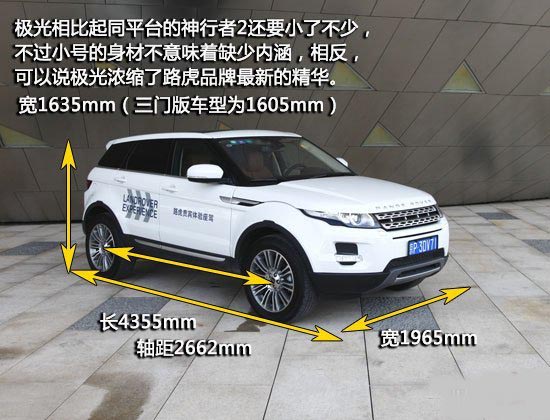 还记得2008年底特律车展上的路虎LRX概念车吗,那辆令人惊艳的概念车就是极光的原型,在量产后极光也在很大程度上保留了概念车的设计元素,尽管尺寸不大,但却被划入揽胜RANGE ROVER的产品序列。极光三门版的长宽高尺寸为4355*1965*1605mm,而五门版车型只是高度增加到了1635mm,相比起同平台的神行者2还要小了不少,不过小号的身材不意味着缺少内涵,相反,可以说极光浓缩了路虎品牌最新的精华。