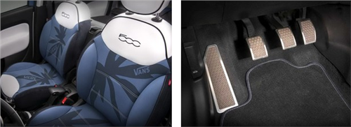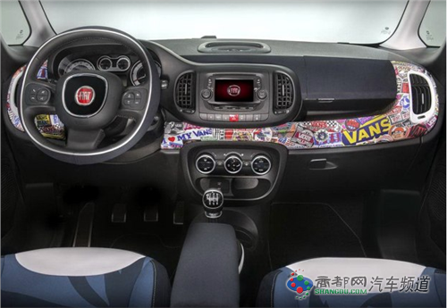 车辆内部,菲亚特500L Vans概念车中控面板采用带有VANS品牌元素的涂鸦装饰,同时该车的座椅还选用帆布材料,而油门踏板、储物箱位置的防滑材料均使用了与VANS品牌鞋底相同的橡胶材质。