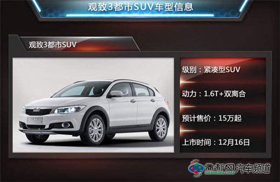 在今年的广州车展上,观致发布了第三款量产车观致3都市SUV。日前,记者从观致汽车官方获悉:观致3都市SUV将于今年12月16日在上海正式发布上市,预计15万元起售。观致3都市SUV基于五门版车型打造,前脸造型设计与五门版车型相基本相同,侧面的整体造型更偏向于Cross风,尾部溜背式的设计加黑色包围配以镀铬防擦版则让该车平添几分“野性”。车身尺寸方面,观致3都市SUV的长宽高分别为4452/1854/1504mm,轴距达2694mm。动力方面有1.6L自然吸气发动机和1.6T涡轮增压发动机可选。