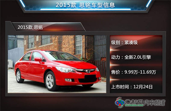 2015款思铭近日公布售价,新车共有三款车型,售价区间为9.99万-11.69万元,将于12月24日正式上市。2015款思铭在外观与内饰上与现款车型并无较大变动,车身尺寸有所提升。新车长宽高为4545/1755/1450mm,长度增加了45mm。 新车将标配主副驾驶安全气囊、ABS+EBD、四向调节方向盘、儿童安全座椅挂钩以及USB接口等配置。顶配车型还将配备16英寸合金轮圈、倒车雷达、真皮座椅、等配置。