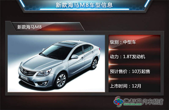 海南一汽海马汽车销售有限公司总经理李伟胜在接受网通社的采访时表示,进入2.0时代后,海马汽车将向 消费者展示新平台、新产品、新技术。普及涡轮增压引擎就是海马汽车近两年的重点之一。李伟胜透露:海马旗下旗舰轿车M8本月将推出搭载1.8T引擎的车型。该发动机最大功率为138kW,与之匹配的是一台6速手自一体变速器。外观方面1.8T车型基本与现款车型基本一致。