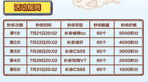 7月21日20:02分第一次车模秒杀终于在万众期待下正式上线, 5000积分即可参与车模秒杀!正式开放时间不到一分钟,60个睿聘CC车模即被抢购一空。在7月22日20:02分又接着上线第二次车模秒杀,4000积分即可参与。同样复制了第一天的盛况,60个长安凌轩车模在不到一分钟的时间即宣告售罄。大家对车模秒杀活动的热情可见一斑。