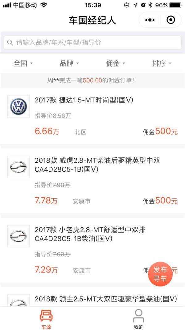 通过车国B端APP,车商可以将车源发布到经纪人带客中。所有经纪人都可通过搜索添加“车国经纪人”微信小程序看到车源(以及对应带客佣金)。同时,有相关需求的经纪人即可在手机上发起申请。互联网时代微信应用已普及,用户可无门槛接入场景,也足以快速达到人与人效率沟通的结果。