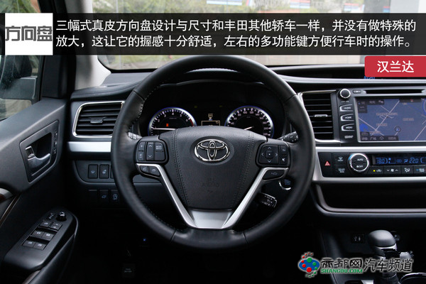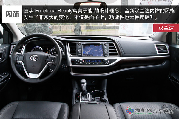 遵从"Functional Beauty寓美于能"的设计理念,全新汉兰达内饰的风格发生了非常大的变化,设计师将功能实用性与造型的美观实现了完美的结合。全新汉兰达在内饰的中大量运用了真皮包裹等高档材质,力图改善驾乘者的感官享受。例如这真皮包裹的方向盘握感舒适,多功能键布局遵循传统设计易于驾驶者能够迅速识别。