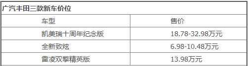 2016年9月10日上午,广汽丰田携凯美瑞十周年纪念版、全新致炫、雷凌双擎精英版三款车亮相大河秋季车展,活动现场公布了三款车的价格,其中凯美瑞十周年纪念版售价区间为18.78-32.98万元,全新致炫售价区间为6.98-10.48万元,雷凌双擎精英版售价为13.98万元。