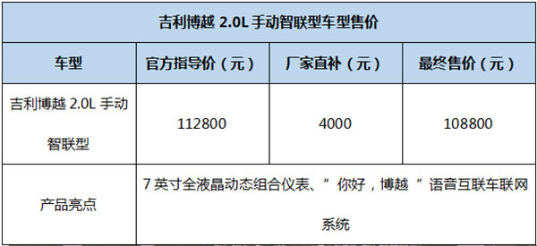 导读:近日,笔者从吉利方面获悉,吉利博越将新增一款2.0L手动智联型车型,官方指导价112800元。在享受厂家购置税补贴4000元之后,智联型最终售价为108800元,目前已开始接受预定。2.0L手动智联型的上市丰富了吉利博越2.0L车型的产品线,进一步增强了博越全系车型的竞争力。