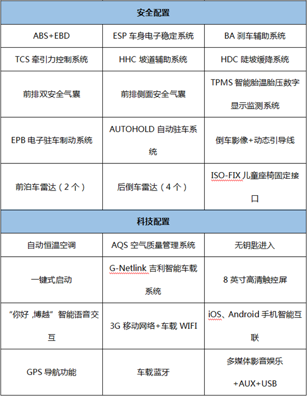 配置方面,智联型在10万SUV区间性价比突出,配备了真皮多功能方向盘、皮质座椅、全景天窗、ESP车身电子稳定系统、上坡辅助、陡坡缓降、胎压监测、自动驻车、倒车影像、无钥匙进入、一键式启动等领先同级配置。当然这款智联型博越最让用户惊喜的配置还是前面提到的G-Netlink吉利智能车载系统。