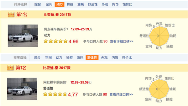 而从购买了比亚迪秦的消费者口碑中也可以看出,其主打的动力(百公里加速5.9秒)、内饰(12.8英寸全高清开放式carpad安卓车载系统等)各方面都获得了消费者的一致认可。在某权威网站的用户满意度排行榜上,秦用户口碑位居前列。其中动力、舒适性等表现尤为突出。