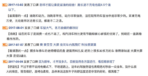 对于很多同时体验过燃油车和比亚迪秦的消费者,他们对这款车的好评维度也非常多,包括油耗低、动力强、舒适性佳等等。有车主甚至高度评价“秦让我感到与众不同超有自信,同时我明显感觉钱包里的钱耐用了,现在我都不适应开燃油车了。”