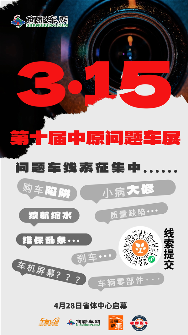 导读:你有料我来爆,你有事,我来帮!第十届中原问题车展线索正在收集中。如果你的用车生活正在遭遇烦恼,不管是购车过程中的合同纠纷,还是用车过程中的动力系统故障、刹车问题、续航问题、又或者是售后维保过程中的小病大修等问题,你都可以积极的联系我们,依托行业优势媒体资源和平台流量赋能,积极建立消费者和厂商的沟通直联渠道,助力您的用车问题快速妥善解决。