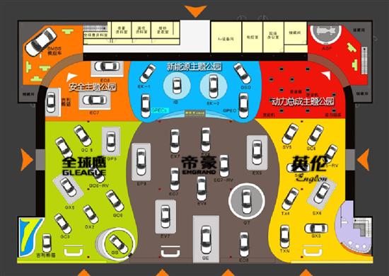 此次吉利展台总体面积超过3000平方米。整个吉利展区分为帝豪、全球鹰、英伦三大子品牌区域和安全、动力总成、新能源三大主题公园,共计六大板块。