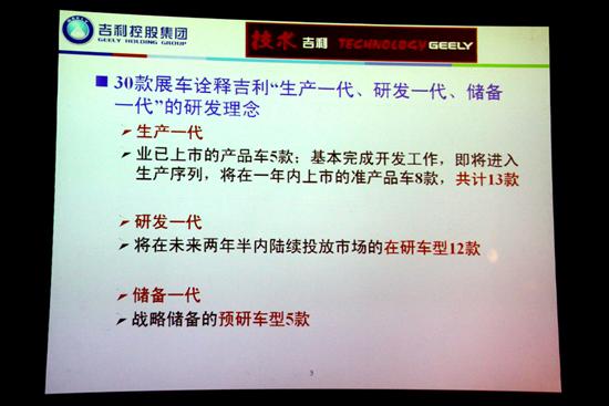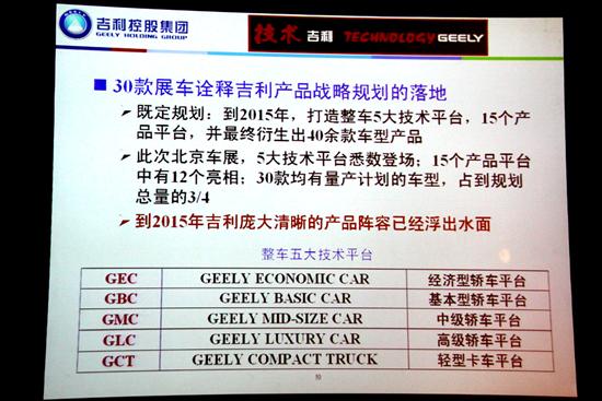 在会上,赵福全博士对吉利的车型阵容做了三个分类:生产、研发、储备。分别对应可以量产、功能研发和概念车型。并表示在2015年之前实现5个整车技术平台、15个产品平台以及衍生出的40款车型。据赵博士介绍,通用的技术平台和产品平台不仅可以有效的降低研发成本,在质量控制上也能实现有效地控制。以后争取做到“看得见的地方都不一样,看不见的地方都一样”。