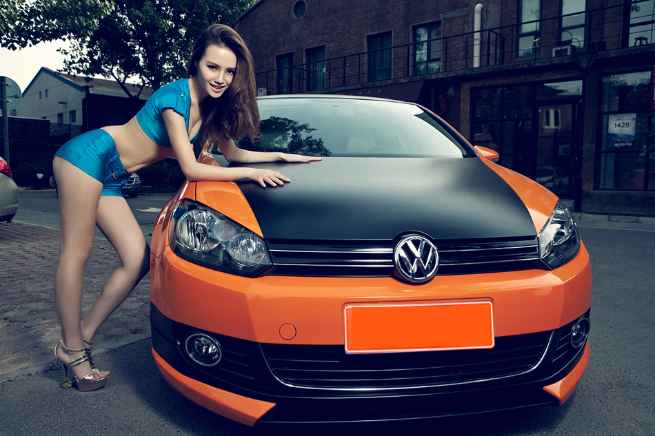 冷艳高挑车模与橙色激情伴侣