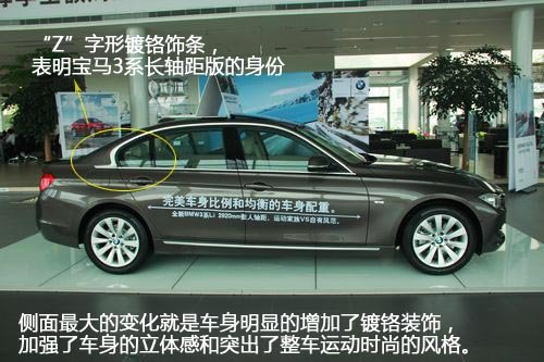 侧面看全新宝马3系基本与老款保持一致,最大的变化就是车身明显的增加了镀铬装饰,整体看来加强了车身的立体感和突出了整车运动时尚的风格。