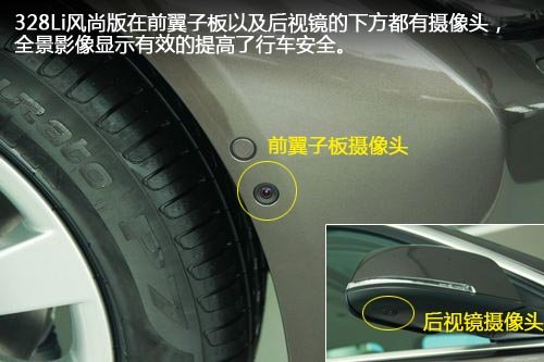 328Li风尚版在前翼子板以及后视镜的下方都有摄像头,全景影像会显示在车内中控台顶端的彩色大屏上,有效的提高了行车安全。