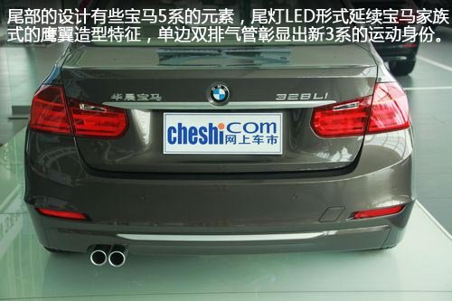 新3系的尾部设计也达到了家族化的统一,尾部的设计有些宝马5系的元素,尾灯LED形式延续宝马家族式的鹰翼造型特征,单边双排气管彰显出新3系的运动身份。