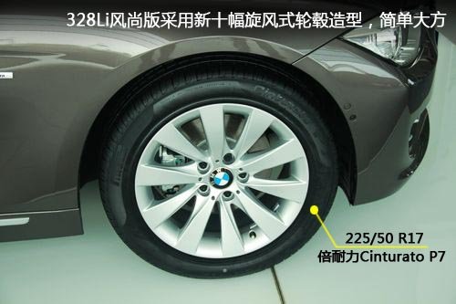 328Li风尚版采用新十幅旋风式轮毂造型,简单大方,轮胎尺寸为225/50 R17,使用的为倍耐力CinturatoP7防爆轮胎。