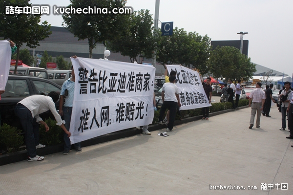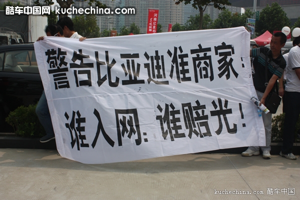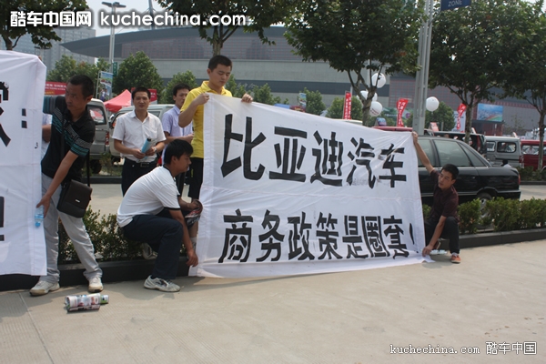 2010年8月27日,郑州大河秋季车展第二天,在车展现场,出现几条白底黑字条幅分外扎眼。上午十一时,在比亚迪展台前突然窜出一伙儿人手持白色横幅。当他们正欲把横幅拉开之时,展台边上十几个身穿工作服的人立刻把他们团团围住并抢夺横幅。双方争夺相持不下,混乱大概持续了十几分钟。出于职业敏感性,到场参加车展的媒体立时纷纷聚拢过来对这一场景进行拍摄报道。