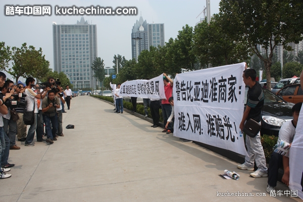 河南比亚迪经销商协会的成员忍无可忍,虽然在室内展厅比亚迪展台前没有“举旗”成功,但是他们终于在室外展示区拉起横幅,吸引了几十家媒体记者前来报道,更有数百名群众围观。