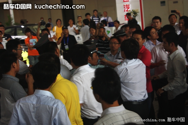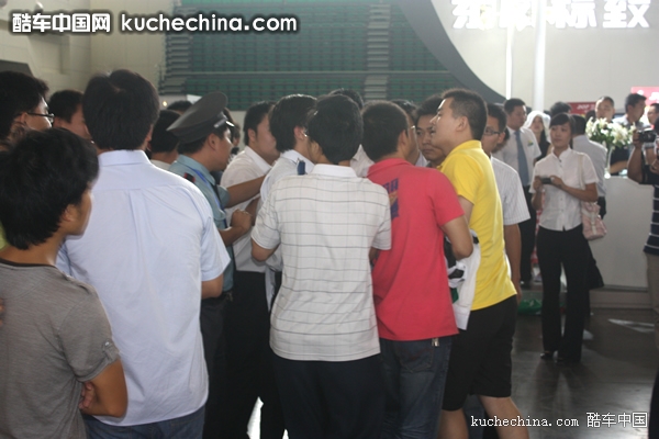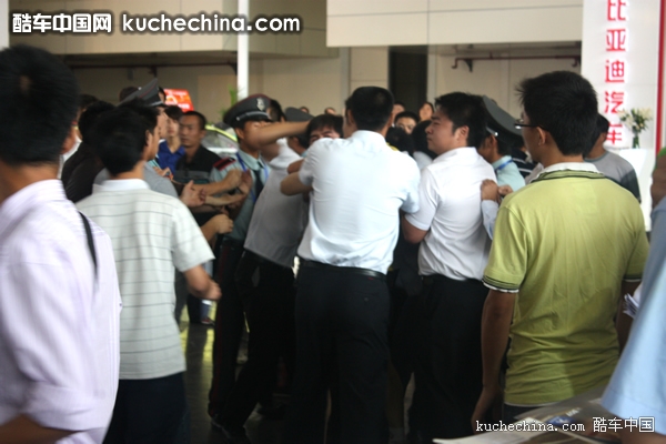 这些身穿制服的工作人员是厂家代表,他们一直在比亚迪展台四周欲对经销商协会的这一活动进行阻挠。现场比亚迪厂商工作人员和经销商代表纠集成一团,厂商还派人抢夺媒体拍摄器材,一些媒体同行甚至吃“黑拳”,更有女记者被厂商工作人员围堵,场面一度失控。