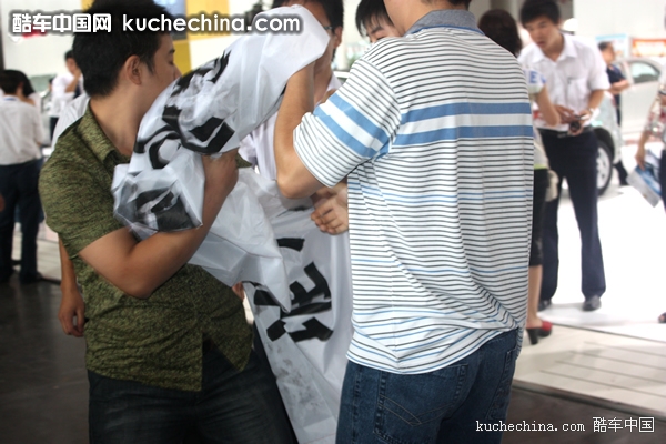 展台前,比亚迪经销商们欲拉出横幅受到厂家阻拦