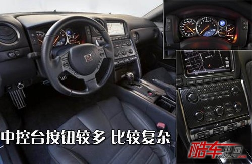 打开车门,您会发现运动型的方向盘上配有醒目的GT-R标志。中控台略显凌乱,一些旋转式的按钮有点八十年代的感觉。不过,显示屏还是很吸引人的。