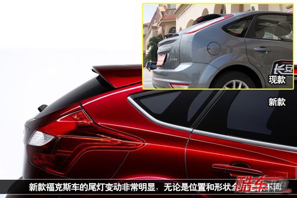 新款福克斯车尾部的最大变动要算是尾灯了,无论是位置还是形状权与老款不同,新车尾灯与车身融为一体,在侧面则作为了上腰线的延长体,完全取代了现款在车后窗两侧的长方形尾灯,体现了更为张扬的风格。