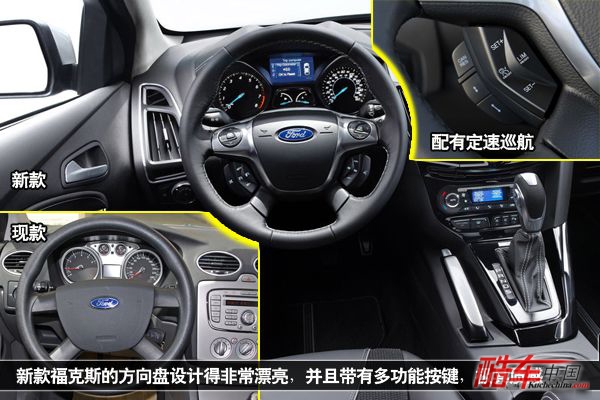 新福克斯的方向盘完全不同于老款的简单四辐式设计,而是集成了多功能按键,这也是目前的主流趋势。同时新方向盘更为饱满且充满质感,无论握感还是实用性都提升了一个档次。