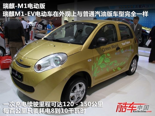 这款瑞麒M1-EV电动车在外观上与普通汽油版车型完全一样,在车身尺寸方面也没有任何差别,只是在原来加油的位置换成了充电接口,标识M1将变成M1EV。在动力系统方面,瑞麒M1-EV一次充电续驶里程可达120-150公里,每百公里只要耗电8到10千瓦时,另外瑞麒M1-EV变速器上只有D(前进)、N(驻车)、R(倒车)3个挡位,开起来应该比自动挡轿车还要简单。