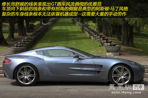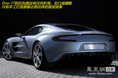 作为一款体现古典美学的传统大型豪华GT布局跑车,One-77修长而舒展的线条既有豪华跑车风流倜傥的享乐主义风格,又表现出如同猛兽一样的力量感。侧面错综复杂的线条显然不是机器加工能够表现出的效果,完全依靠手工打造的铝合金面板让One-77看上去和流水线出身的大路货明截然不同。光滑的车尾看上去浑然一体--除了可升降的尾翼,甚至连道接缝都看不到。千万别为失去行李箱而苦恼,在这款车上你根本不需要那玩意,因为浑然一体的尾部面板是手工打造的有力证明。