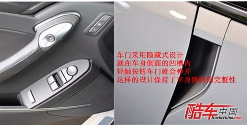 CTS COUPE最有特点的当属隐藏式电子车门,与大多数COUPE车型的外置式门把手不同,它的设计师当时要求在车门上不要有任何突出物,设计师的一句话可难坏了通用的工程师们,他们很聪明地将电子触碰式后备箱的里面移植到车门中,采用全新的电子车门,只要使用者轻轻触碰电子开关,车门便会打开。而当车内蓄电池用尽后,可通过车内的机械开工打开车门。