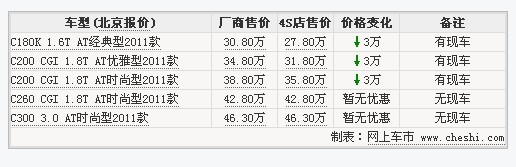 C级轿车自2007年引入国内市场之后一直是奔驰在国内销售最好的豪华轿车,此次改款奔驰将C级安全、配置、内饰以及外观进行了全面升级,让C级轿车重装上阵。2011年7月16日,梅赛德斯-奔驰将正式推出改款C级轿车,此次上市的新车共有3个排量5款新车,售价为30.8万-46.3万,据网上车市价格监测系统显示,目前奔驰C级全系最高降3万,详情请看下表: