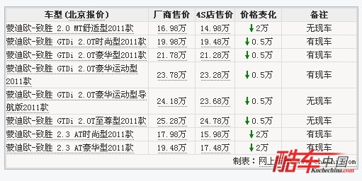 2011款福特蒙迪欧-致胜将在中国大陆地区正式上市。此次上市的新车共有三种排量8款车型。售价区间为16.98万-25.28万。根据网上车市价格监测系统显示,目前2011款蒙迪欧-致胜全系最高降2万,2.0T车型降5千,详情请看下表: