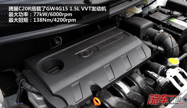 腾翼C20R搭载了长城自主研发的GW4G15的1.5L全铝VVT发动机,最大功率为77kW/6000rpm,最大扭矩为138Nm/4200rpm,匹配5挡手动变速箱。
