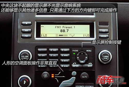 由于还未正式向中国市场引进,所以我们拍摄的这款车的人机交互界面全部为英文,操作起来不太方便。另外,XC70还配备了“Premium Sound”尊贵级音响系统,它是沃尔沃忠实的高保真音响爱好者和丹麦扬声器专家丹拿(Dynaudio)以及杜比实验室长期亲密协作的结晶。D级数字放大器可产生最大650瓦功率的音效。杜比ProLogicII环绕声配合中置音箱和音频处理器,能够让5个座位方向获得同等的听觉效果。车内12个Dynaudio音箱都自带滤波器与其它音箱协调,且每扇车门上都有一套独立的高、中、低音喇叭,后背门也配备了类似的高、低音喇叭。仪表板上的中置音箱是环绕立体声的中枢神经,由它释放出环绕音效。