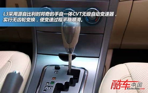 内饰方面,L3的整体风格依旧是比较居家的感觉,中控部分上深下浅的设计也比较正统,不过中控部分引入的一些仿金属拉丝的设计倒是还比较时尚。另外,全系的大液晶屏配置也让整车的感觉更加高档了些,另外高配车型还引入了多功能方向盘,本次上市的两款CVT车型全系标配无钥匙启动、倒车可视系统、倒车雷达、自动感应大灯、电动调节外后视镜等等,给人的感觉是自主品牌在这些细节配置方面有了很大程度的提高。在安全配置方面,L3也配备了ABS(EBD)、前排双气囊、前排侧气囊(高配车型)等安全配置,虽然不如奇瑞A3率先引进了ESP,但是对于这一价位的自主车型来说也已经很厚道了。