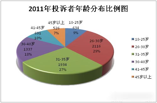 在中国汽车质量网2011年投诉中,对投诉消费者人群年龄进行分析:18-25岁(包含25岁)之间投诉的消费者有634人,26-30岁(包含30岁)之间投诉的消费者有2116人,31-35岁(包含35岁)之间投诉的消费者有1934人,36-40岁(包含40岁)之间投诉的消费者有1337人,40-45岁(包含45岁)之间投诉的消费者有691人,45岁以上投诉的消费者有526人。