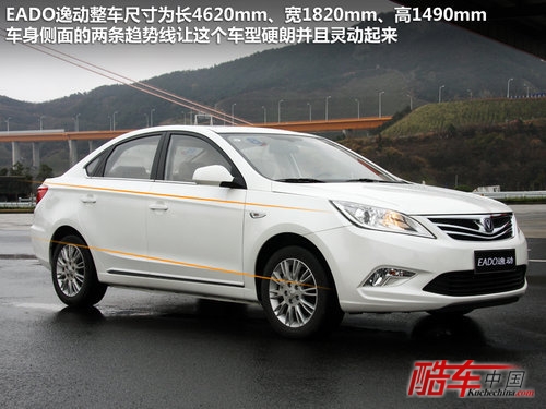 EADO逸动整车尺寸为长4620mm、宽1820mm、高1490mm。车身侧面的两条趋势线让这个车型硬朗并且灵动起来。除车身前脸外,车身侧面厚重的同时凌厉之感同样得以体现,车侧线条硬朗,微微上扬的腰线与上车顶线条汇于短小的尾部,令整车时尚感倍增。