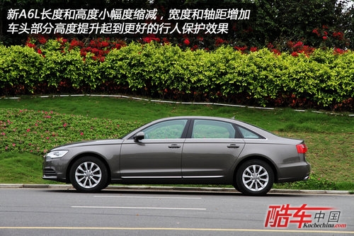 新款A6L的车身尺寸与老款相比,宽度增加高度减少,因此看上去就像匍匐在路面上,狭长的大灯和六边形格栅进一步强化了这种效果,让A6L看上去显得很低矮,具有轿跑车的运动感。其实这只是设计师的设计手段,真实的情况是,新A6L的车头比老款抬高了,此举在于适应日益严格的行人碰撞法规。另外新A6L的整车空气阻力为0.26Cd,仅次于奔驰E级的0.25Cd,属于当前同级别的优异水准。